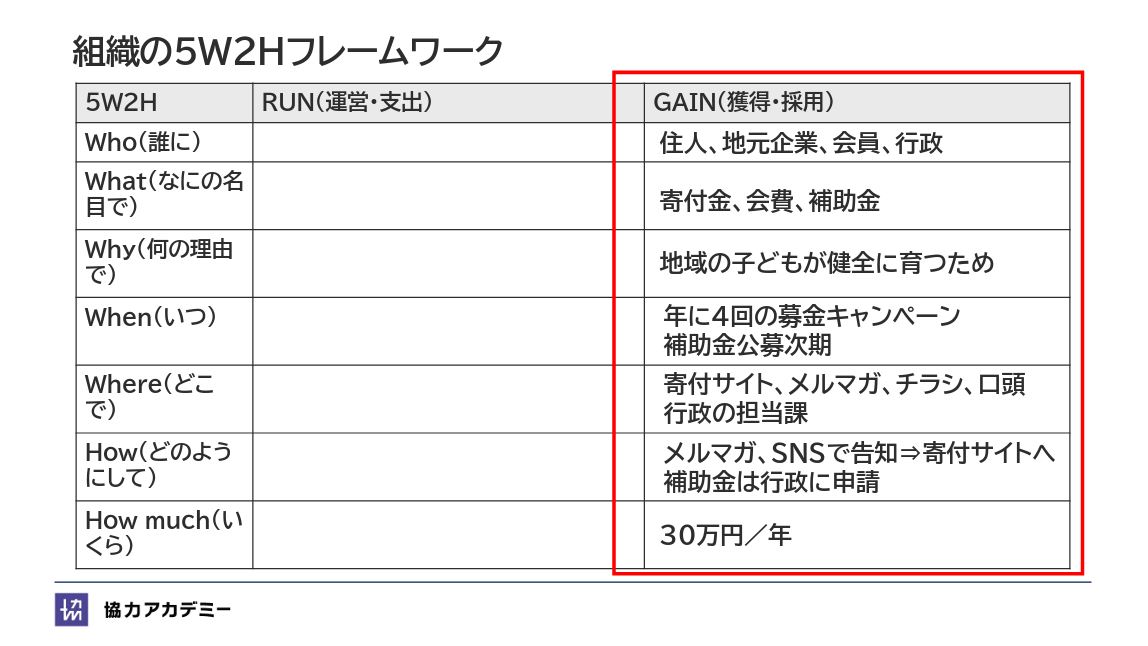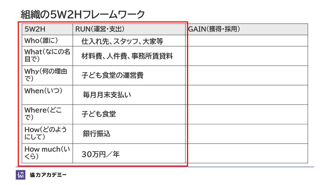 組織の5W2Hフレームワークは、協力アカデミー独自の設計ツールです。