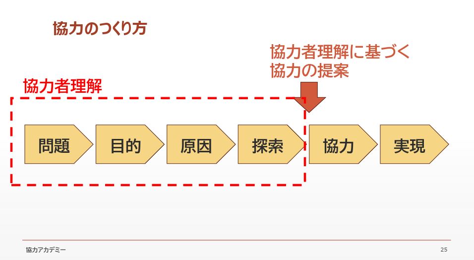 協力者の問題、目的、原因、探索のメカニズムを深く知り、協力者理解に基づく協力の提案ができるかがポイントとなります。それにより、協力がつくられ、協力者は自らの目的を実現することができます。