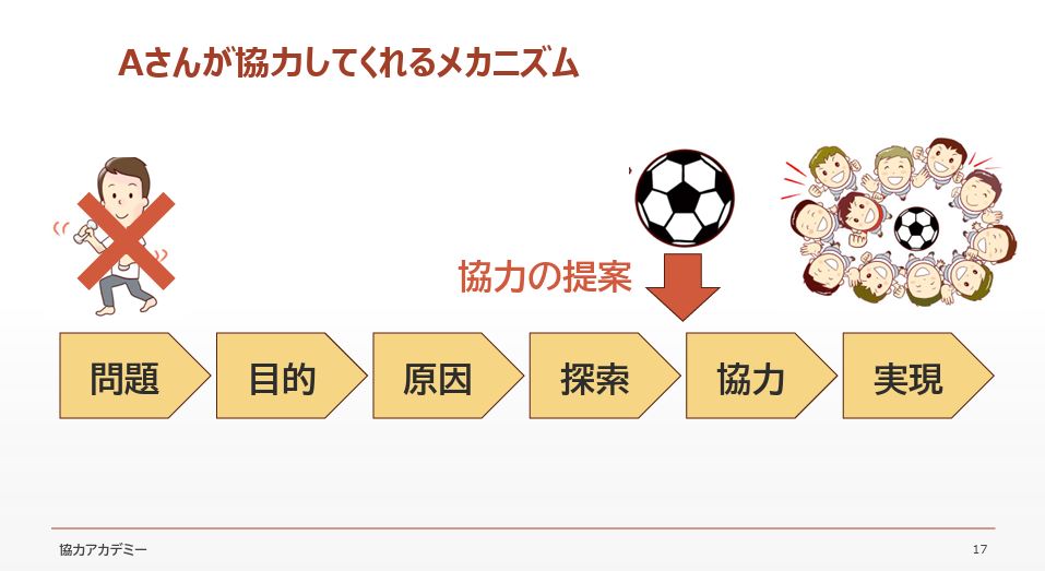 ここで、あなたが「サッカーチームに参加して一緒に大会に出ないか」という協力の提案をすると、その提案はAさんにとって問題の原因を解決し、目的の実現につながる内容になります。その結果、協力が成立します。