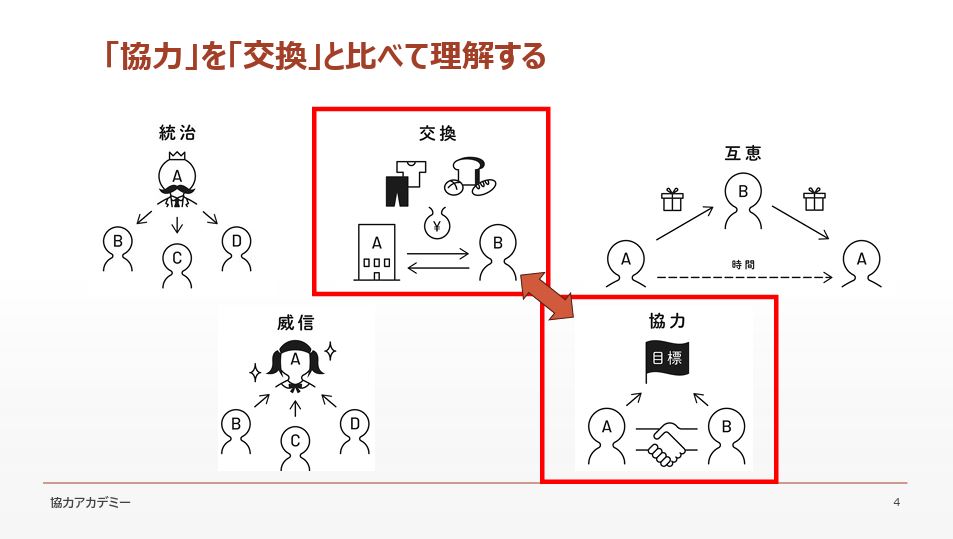 「協力」を理解するためには、まず「交換」との違いを理解することが有効です。