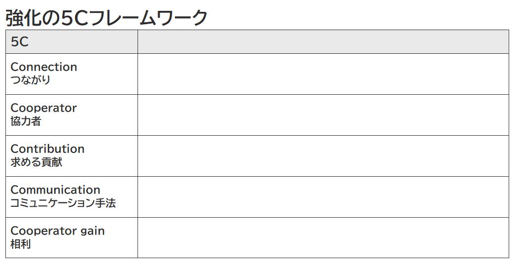 「強化の5Cフレームワーク」は、既存の協力者との関係を深めるために、施策の要素を整理するためのフレームワークです。