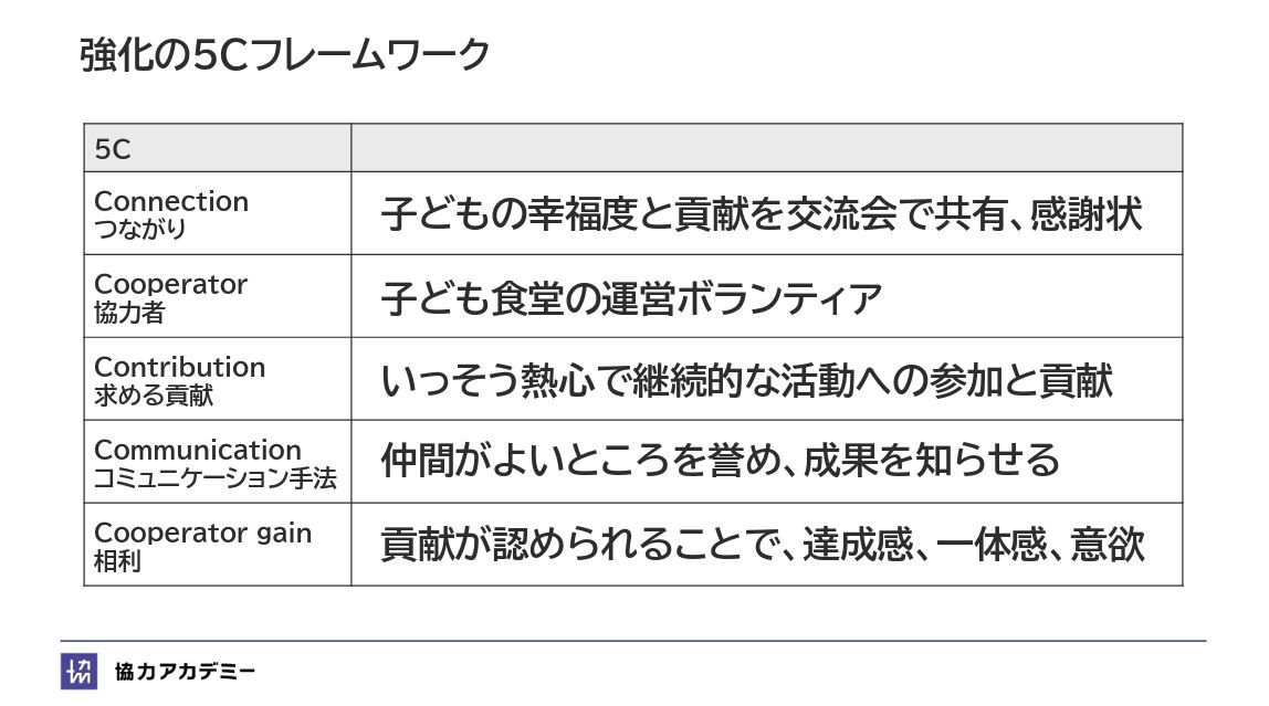 動画では、「子ども食堂」の事例を用いて、強化の5Cフレームワークの使い方を説明しています。