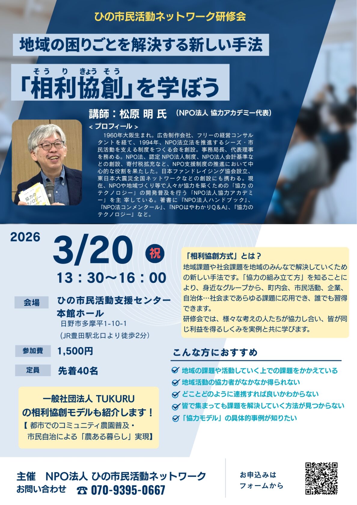【リアル・無料・日野市】3月20日(金)「相利協創(そうりきょうそう)」を学ぼう 〜地域の困りごとを解決する新しい手法〜に松原が講師として登壇します