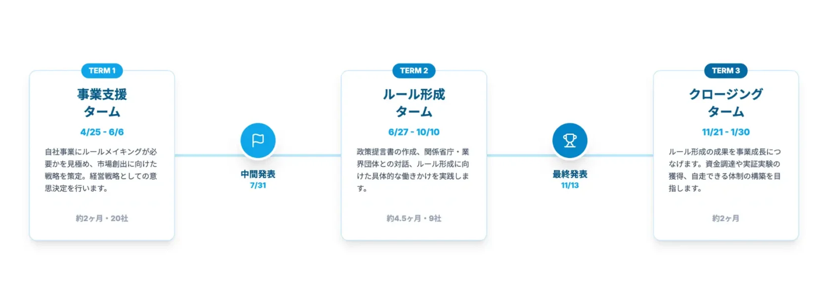 今期は、この実績を超える成果創出を目指し、支援体制を大幅に強化しました。 まず「事業支援ターム」にて20社を採択し、ルール形成に向けた戦略策定を支援。その後、審査を通過した有望な9社を最終採択し、専門家による本格的なルールメイキング伴走支援を行います。より多くのスタートアップに機会を提供しつつ、見込みのある事業にはリソースを集中投下することで、確実な社会実装を狙います。